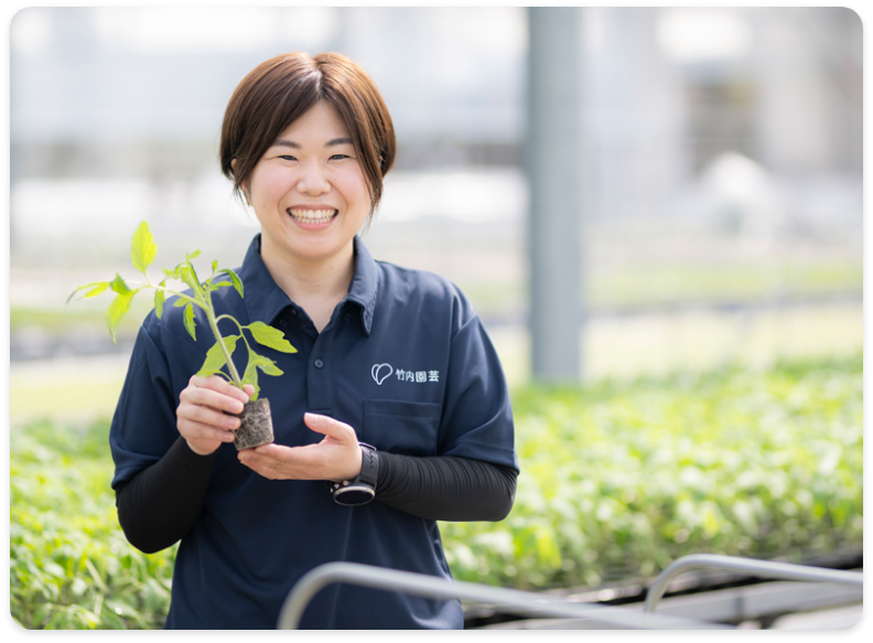 私たち竹内園芸は、昭和47年創業、57年設立の会社です。キュウリやトマト、ナスなどといった果菜を中心に、60品目、2,000品種以上もの多種多様な野菜苗を生産している会社です。